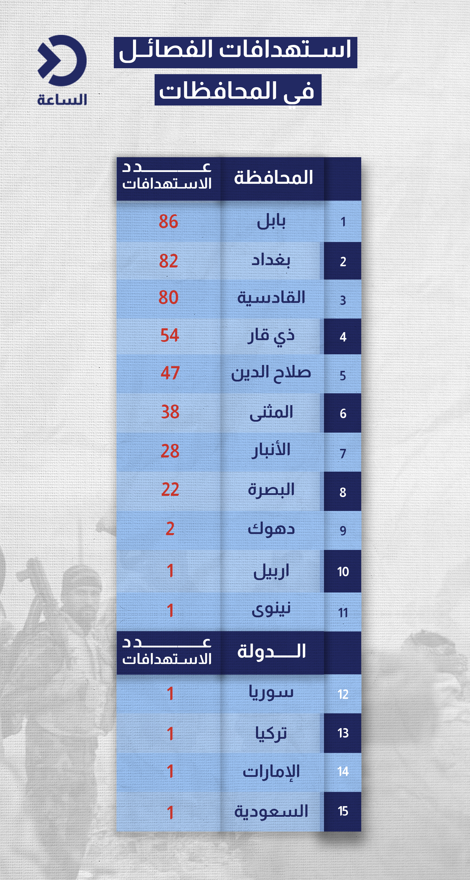 بابل كانت أكثر المحافظات التي وقعت فيها استهدافات؛ إذ بلغ عددها 86 استهدافًا، وفي المرتبة الثانية حلت العاصمة بغداد بعدد 82 استهدافًا، بينما جاءت القادسية بالمرتبة الثالثة بعدد 80 استهدافًا، في حين بلغ عدد الاستهدافات داخل ذي قار 54 استهدافًا.