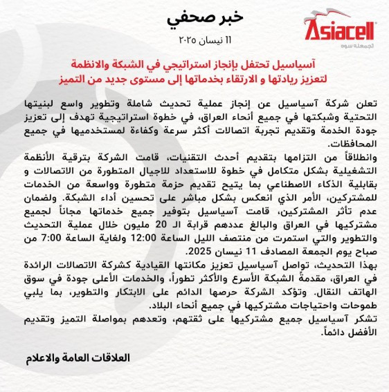 أصدرت شركة آسياسيل للاتصالات، اليوم الجمعة، توضيحاً عن إتاحة جميع خدماتها الليلة الماضية بشكل مجاني لجميع مشتركيها البالغ عددهم 20 مليوناً، مؤكدة أن ذلك لم يكن خللاً بل عملية تحديث شاملة وتطوير واسع لبنيتها التحتية وشبكتها في جميع أنحاء العراق.