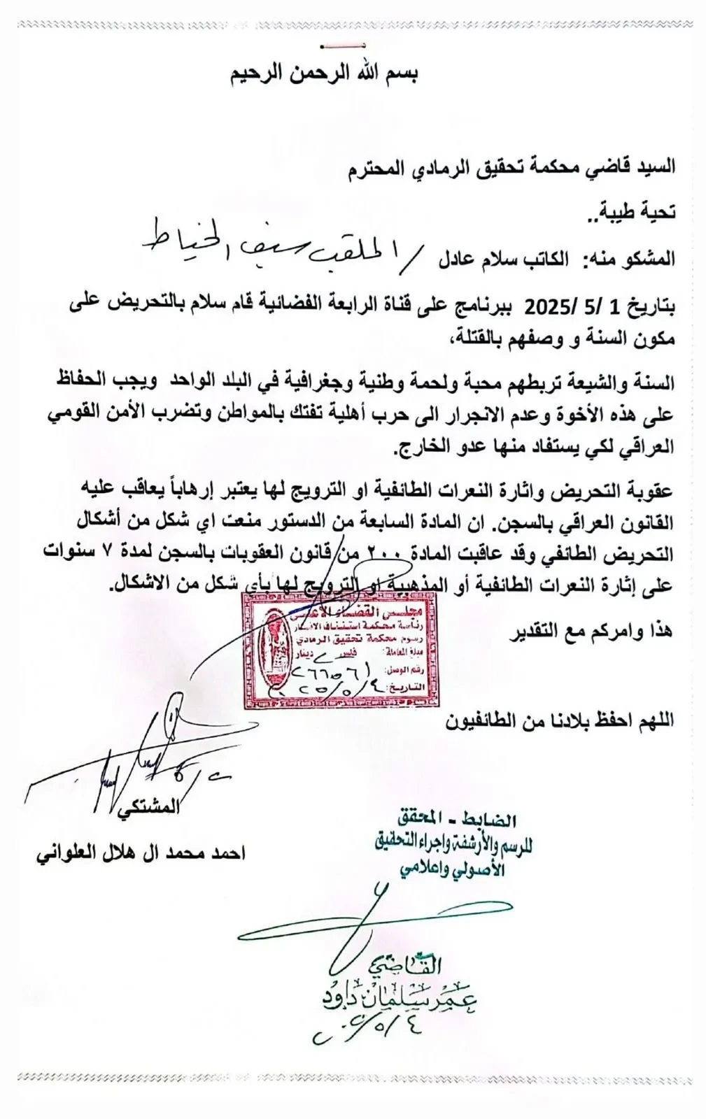 كشفت وثيقة، حصلت عليها شبكة "الساعة" اليوم الأحد، عن رفع دعوى قضائية ضد الكاتب سلام عادل والملقب بـ سيف الخياط، وذلك بعد تصريحاته المثيرة للجدل خلال استضافته على قناة "الرابعة"، إذ قام بالإساءة إلى المكون السُني من خلال وصفهم بـ"القتلة".