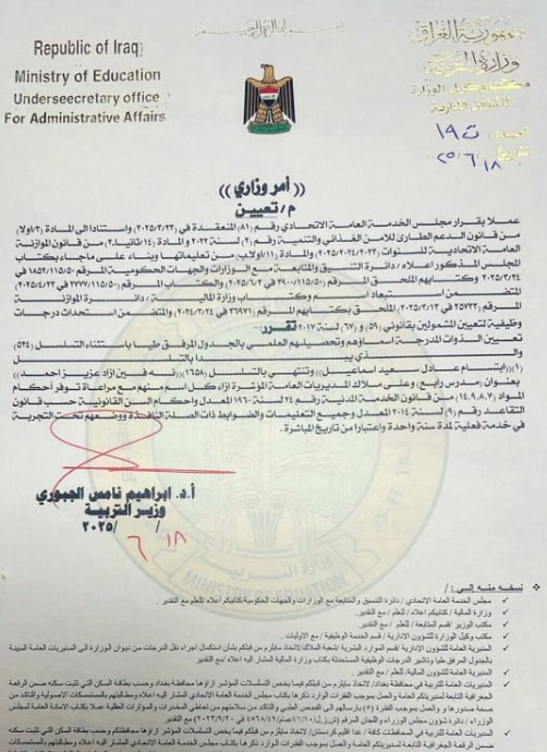 صادق وزير التربية، إبراهيم نامس الجبوري، على أوامر تعيين ألف و658 خريجاً من المشمولين بالتعيينات، وذلك وفقاً لوثيقة حصلت عليها شبكة "الساعة".