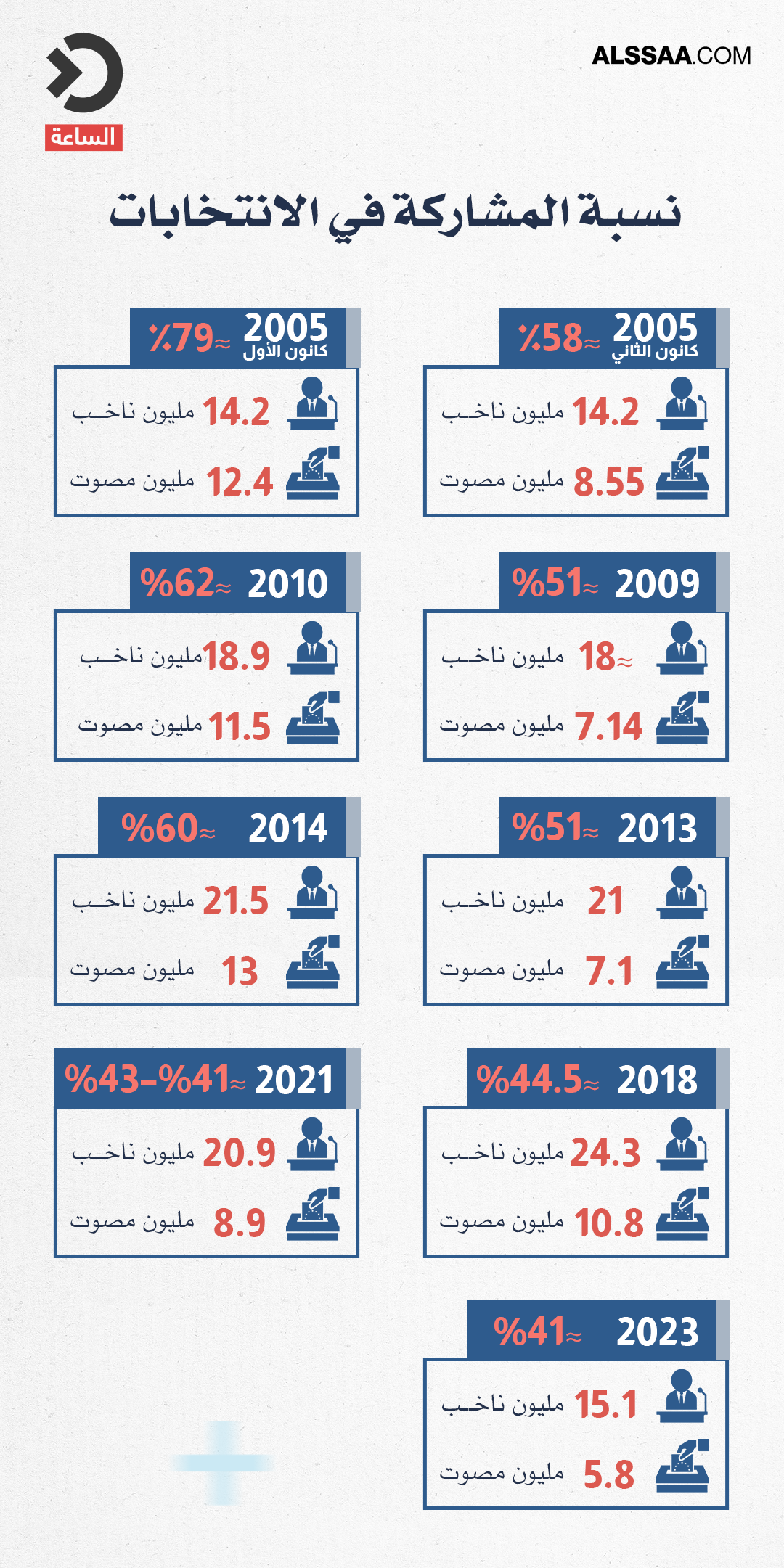 - ذروة المشاركة في 2005 ثم اتجاه تنازلي عام: حققت الانتخابات الأولى عام 2005 (خصوصًا دورة ديسمبر) أعلى نسبة إقبال شعبي تجاوزت 79%. لكن منذ ذلك الحين أخذت نسبة المشاركين في هبوط تدريجي: حوالي 62% في 2010، 60% في 2014، لتنهار إلى 44% في 2018، ثم 41–43% فقط في 2021. هذا الاتجاه مشابه أيضًا في الانتخابات المحلية (من 58% في 2005 إلى 51% في 2013 ثم 41% في 2023).