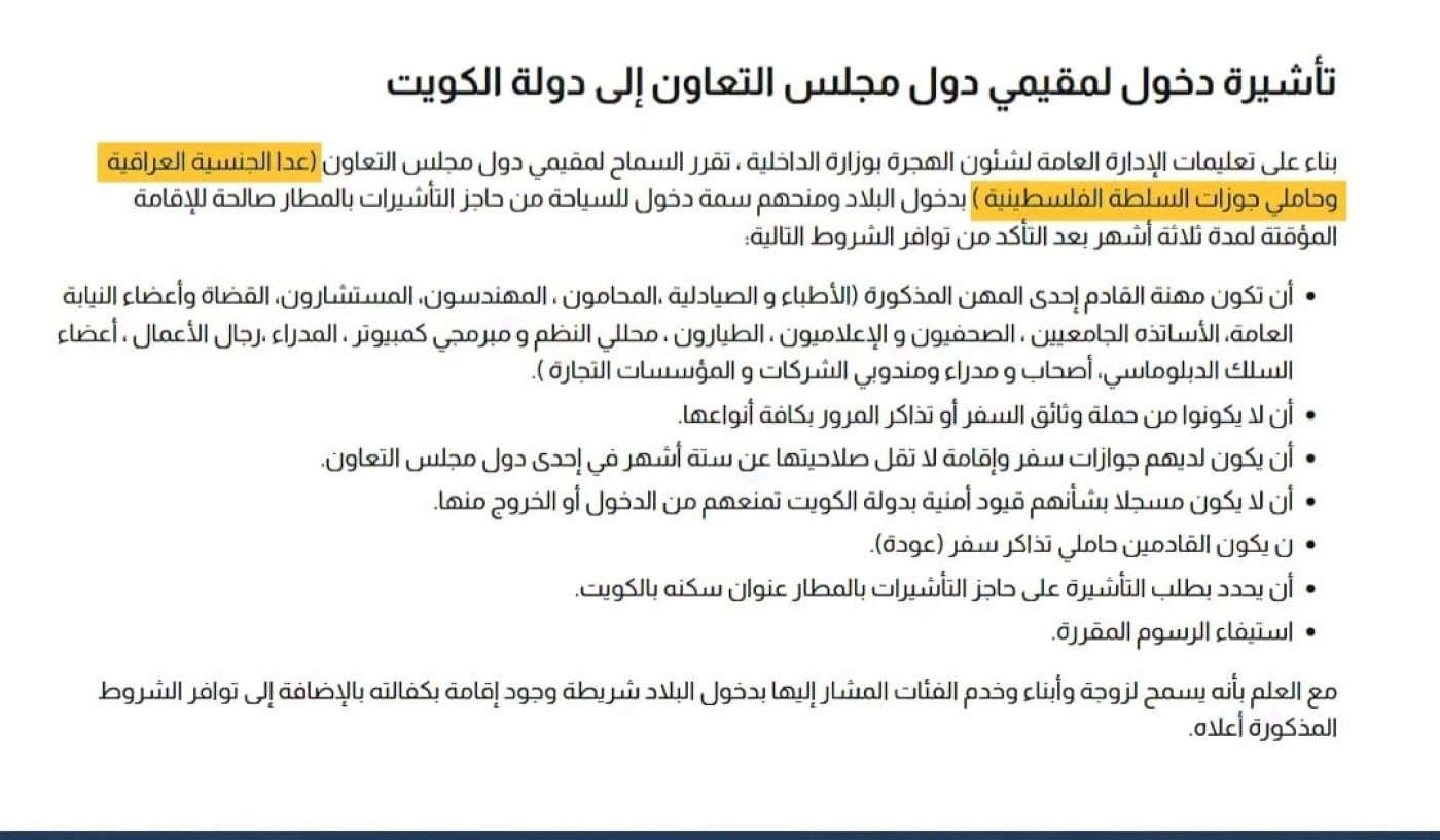 أعلنت وزارة الداخلية الكويتية، عن إلغاء نظام التأشيرة المسبقة لمقيمي دول مجلس التعاون الخليجي الراغبين بدخول الكويت، مع استثناء المقيمين من العراق وفلسطين.
