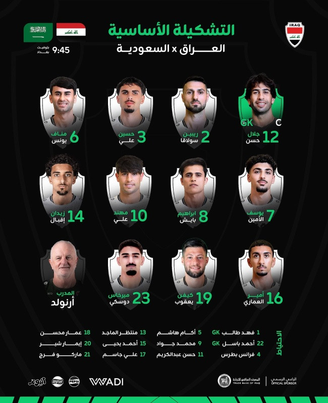 أعلن الجهاز الفني للمنتخب الوطني، اليوم الثلاثاء، التشكيلة الرسمية التي ستخوض مواجهة المنتخب السعودي ضمن التصفيات المؤهلة لكأس العالم 2026.