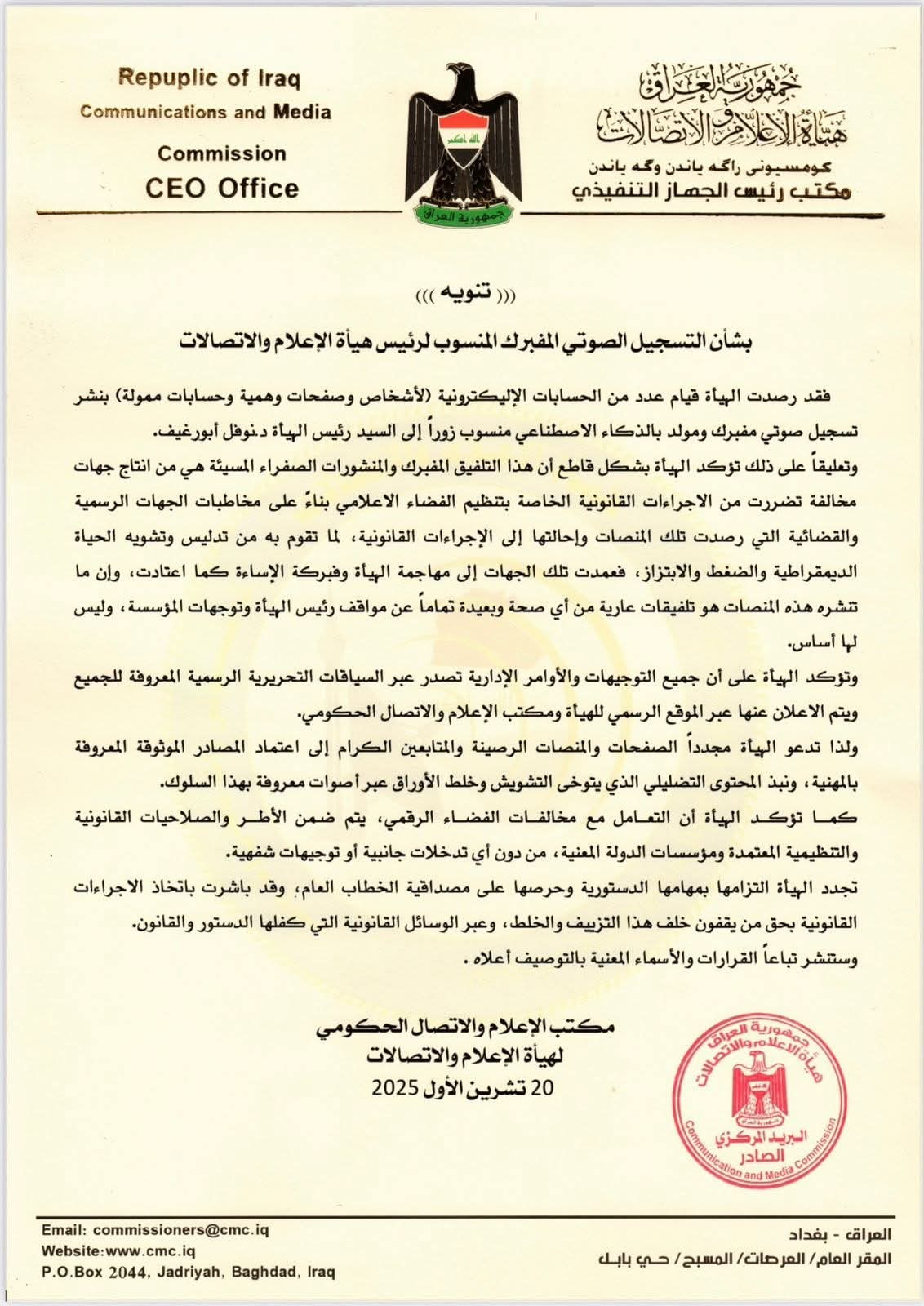 نفت هيئة الإعلام والاتصالات، اليوم الثلاثاء، التسجيل الصوتي المنسوب لرئيسها، مبينة أن التسجيل مفبرك ومولد بالذكاء الاصطناعي، وفقاً لوثيقة حصلت عليها "الساعة".