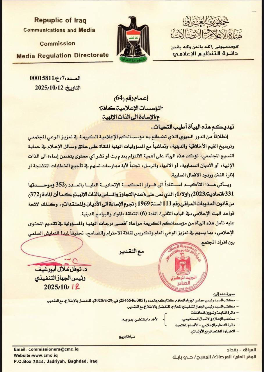 أكدت هيئة الإعلام والاتصالات العراقية، منع بث أو نشر أي محتوى يسيء للذات الإلهية والأديان والأنبياء، أو أي خطاب سيهم في تأجيج الفتنة أو يثير ردود الأفعال السلبية، بحسب وثيقة حصلت عليها شبكة "الساعة".
