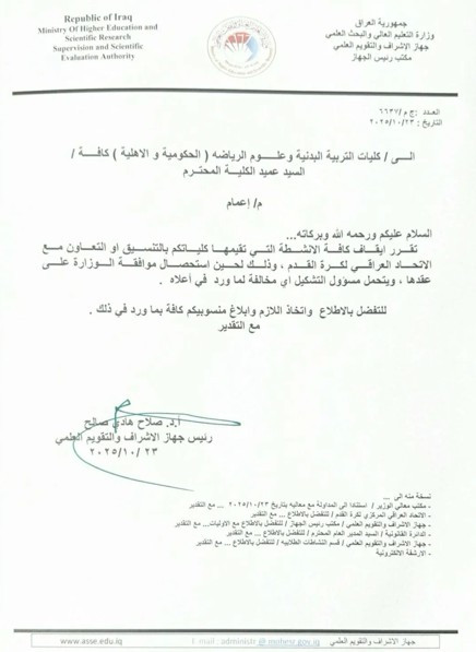 وجهت وزارة التعليم العالي والبحث العلمي العراقية، كليات التربية البدنية وعلوم الرياضة الحكومية والأهلية كافة، بمقاطعة جميع نشاطات اتحاد كرة القدم العراقي، وذلك بحسب وثيقة تلقتها شبكة "الساعة".