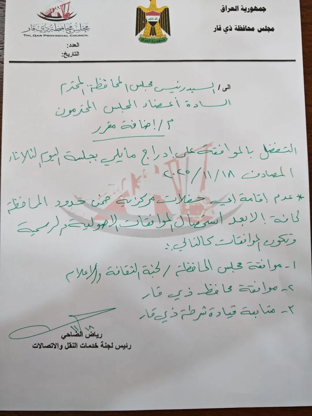 طالب رئيس لجنة خدمات النقل والاتصالات في مجلس ذي قار، رياض الضاحي، اليوم الثلاثاء، رئاسة المجلس بمنع الحفلات المركزية داخل حدود المحافظة، وذلك بعد حفل الفنان محمد عبد الجبار، وفق وثيقة حصلت عليها شبكة "الساعة".