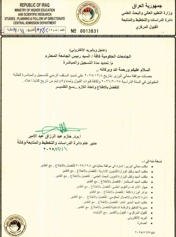 قررت وزارة التعليم العالي والبحث العلمي، اليوم الخميس، تمديد السقف الزمني للتسجيل والمباشرة للطلبة المقبولين في السنة الدراسية 2025–2026 لمدة 5 أيام، وذلك وفقاً لوثيقة تلقتها شبكة "الساعة".