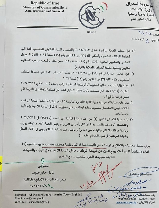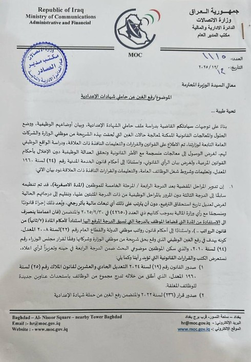 وافقت وزيرة الاتصالات، هيام الياسري، اليوم الاثنين، على المقترحات المقدمة من الدائرة الإدارية لمعالجة ملف حملة الشهادة الإعدادية، وذلك بهدف رفع الغبن وتحقيق العدالة الوظيفية لهذه الفئة من الموظفين، وذلك بحسب وثيقة تلقتها شبكة "الساعة".