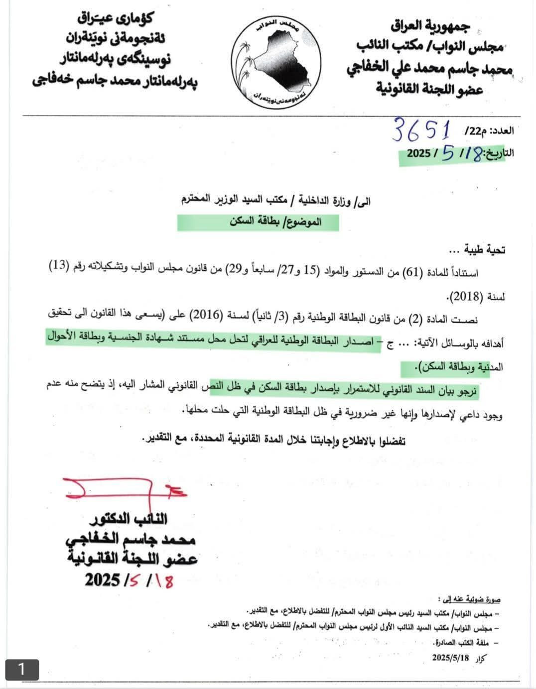 أكد النائب محمد جاسم الخفاجي، اليوم الاثنين، أن بطاقة السكن أي سند من القانون مشيرا إلى أنها ملغية أساسا بعد صدور قانون البطاقة الوطنية رقم 3 لسنة 2016، بحسب وثيقة نشرها الخفاجي وحصلت عليها شبكة "الساعة".
