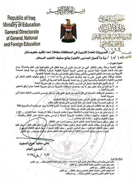 قررت وزارة التربية، اليوم الثلاثاء، شمول المدارس الأهلية بفتح صفوف التعليم المبكر، بحسب وثيقة تلقتها شبكة "الساعة".