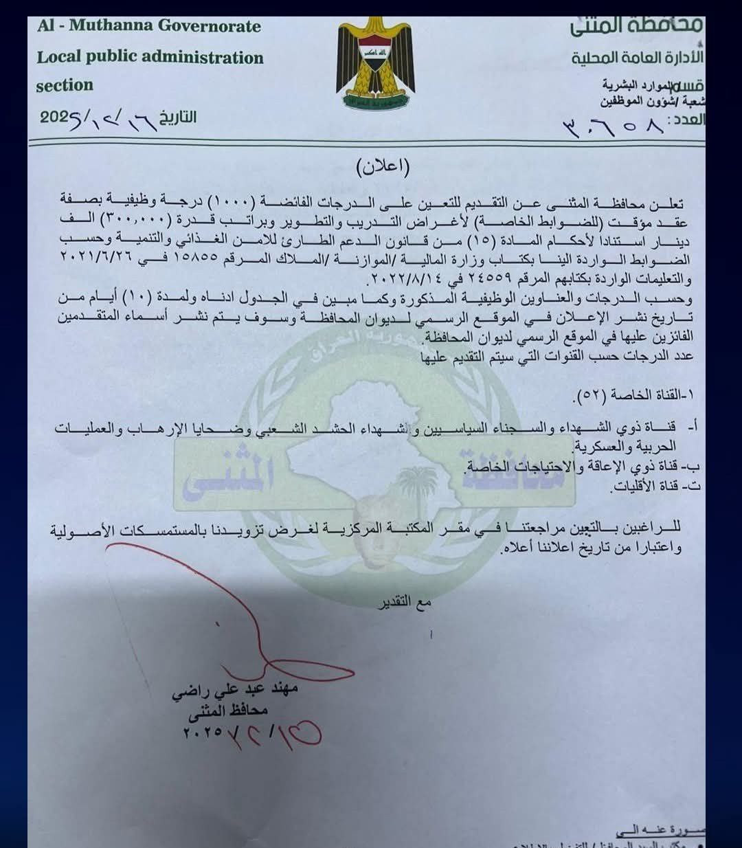 افتتحت محافظة المثنى، اليوم الثلاثاء، باب التعيين بعقد مؤقت براتب يصل إلى 300 ألف دينار ولألف درجة على أن تكون مدة التقديم 10 أيام من تاريخ نشر الإعلان بحسب وثيقة حصلت لشبكة "الساعة".