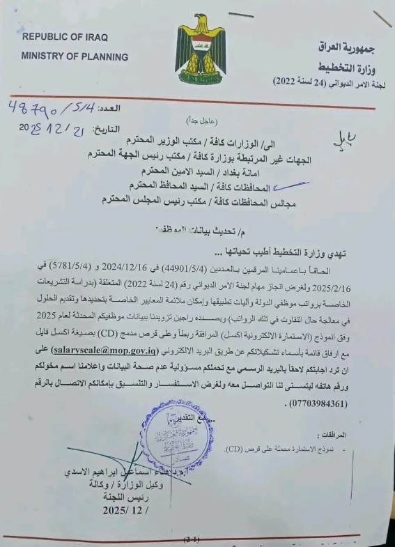 دعت وزارة التخطيط، جميع الوزارات والجهات غير المرتبطة بوزارة، إلى تحديث بيانات الموظفين لغرض دراسة ومعالجة تفاوت الرواتب، وذلك بحسب وثيقة تلقتها شبكة "الساعة".