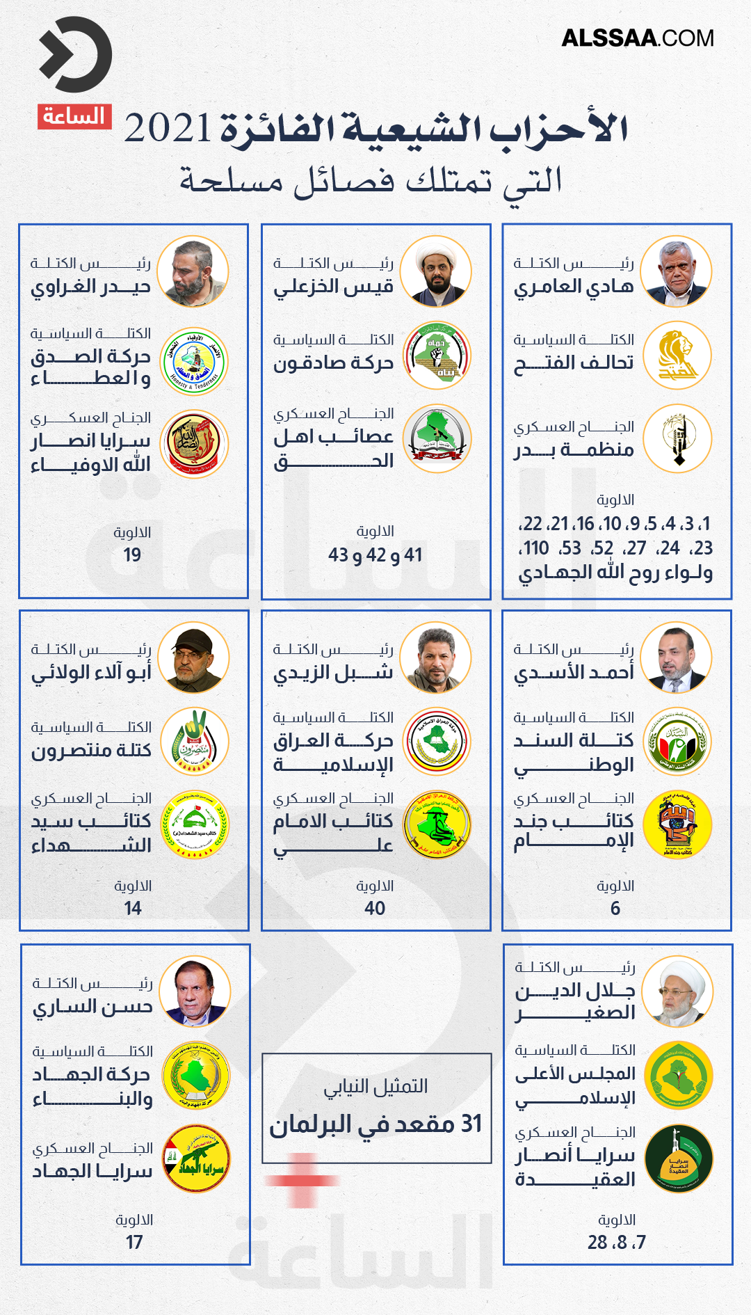 5- العقد الوطني برئاسة فالح الفياض: 4 مقاعد، يمتد النفوذ العسكري لرئاسة الحشد الشعبي وألوية وأفواج عشائرية في محافظات ديالى، صلاح الدين، نينوى، الأنبار ، يستثمر النفوذ في الأفواج العشائرية في التأثير الانتخابي لأبناء العشائر المشكلة للألوية والتحصيل الانتخابي في انتخابات 2021: 236 ألفًا و 713 صوتًا