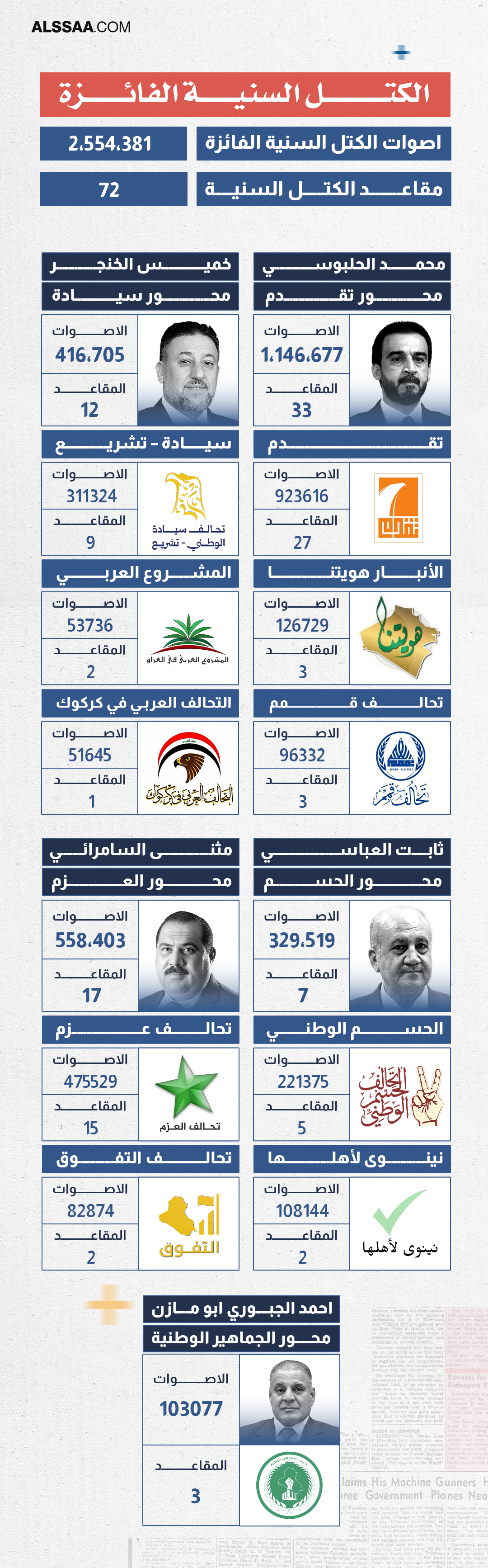 كما تكشف الأرقام أن القوى السنية اعتمدت على تعدد القوائم لزيادة مجموع الأصوات بدل التمركز في تحالفات كبيرة، وهو ما أعطاها انتشارًا أوسع وتأثيرًا أشد في مفاوضات تشكيل الحكومة المقبلة.