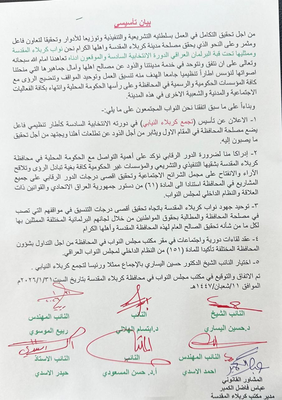 أعلن عدد من نواب محافظة كربلاء، اليوم السبت، تأسيس "تجمع كربلاء النيابي" خلال الدورة النيابية السادسة، ليكون إطاراً تنظيمياً يهدف إلى توحيد المواقف وتنسيق الجهود التشريعية والرقابية بما يخدم مصلحة المحافظة وأهلها.