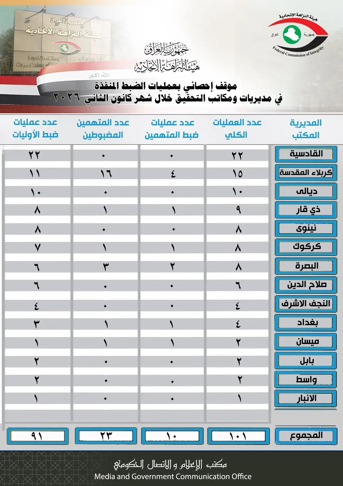 أعلنت هيئة النزاهة الاتحادية في العراق، اليوم الاثنين، عن إحصائية لعمليات الضبط المنفذة خلال شهر كانون الثاني الماضي.