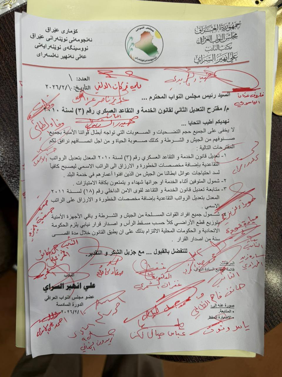 جمع النائب علي نهير، اليوم الأربعاء، تواقيع عدد من أعضاء مجلس النواب لتعديل قانون الخدمة والتقاعد العسكري رقم 3 لسنة 2010، مطالبا بإضافة مخصصات الأرزاق والخطورة إلى الراتب الاسمي واحتسابها ضمن الراتب التقاعدي، بحسب وثيقة وردت لشبكة "الساعة".