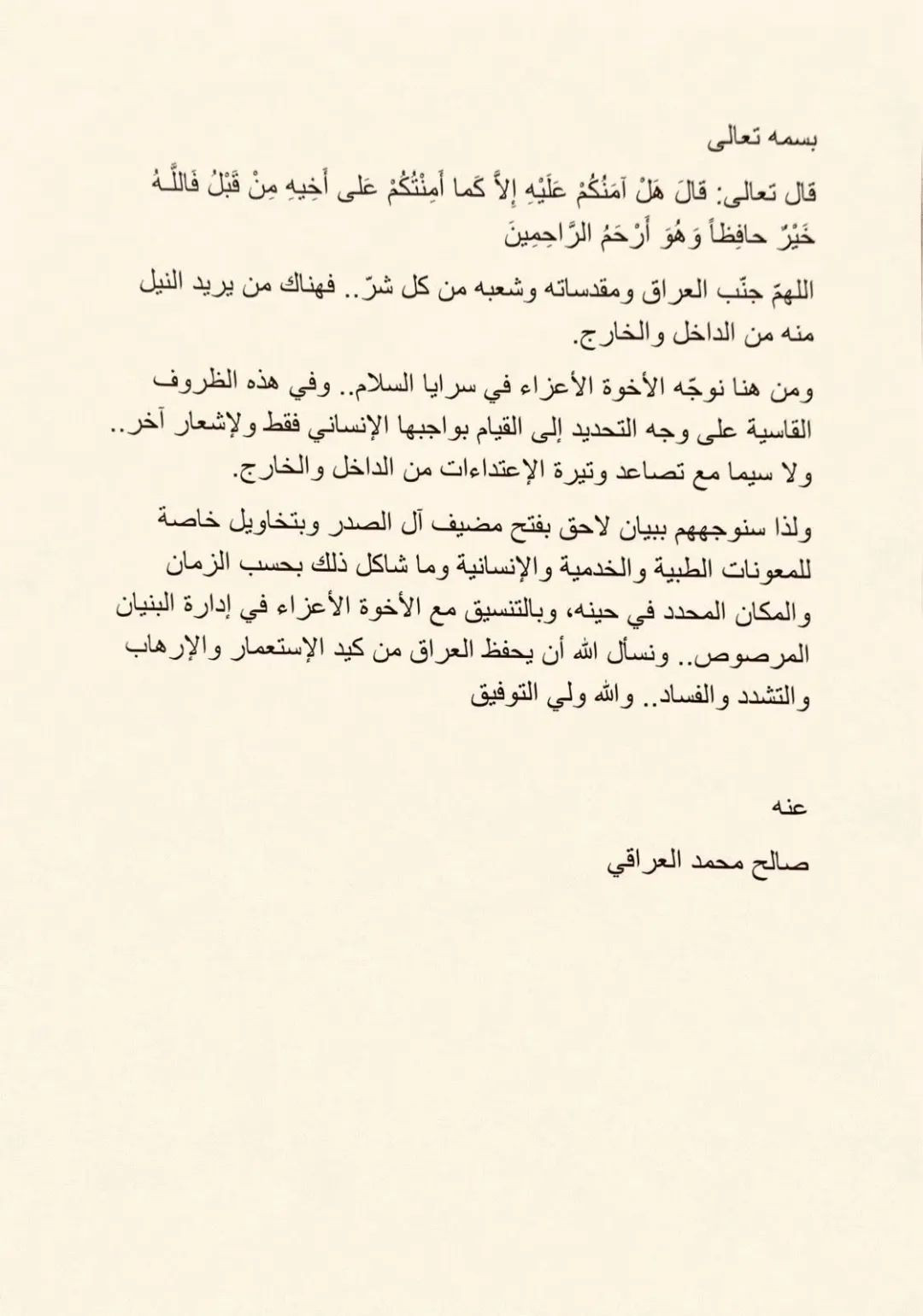 وأشار إلى أنه "سيتم إصدار بيان لاحق يتضمن فتح مضيف آل الصدر وتخويل جهات محددة لتقديم المساعدات الطبية والخدمية والإنسانية، وفقاً للزمان والمكان اللذين سيُحددان لاحقاً، وبالتنسيق مع إدارة البنيان المرصوص".