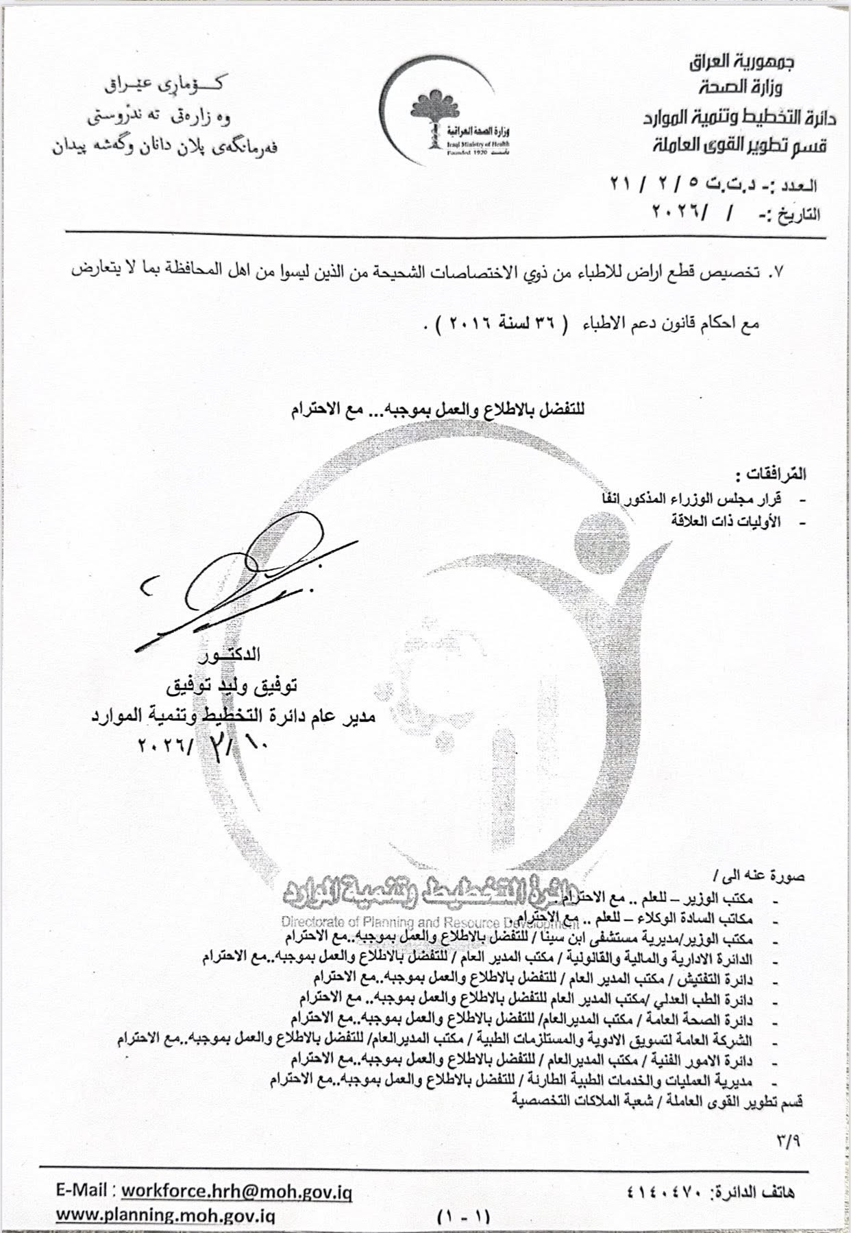 كشفت وزارة الصحة العراقية، اليوم الثلاثاء، عن توصيات محضر لجنة الأمر الديواني "24395 لسنة 2024" بشأن دراسة الواقع الصحي ونقص الملاكات الطبية من الاطباء بصورة عامة، بحسب وثيقة تلقتها شبكة "الساعة".