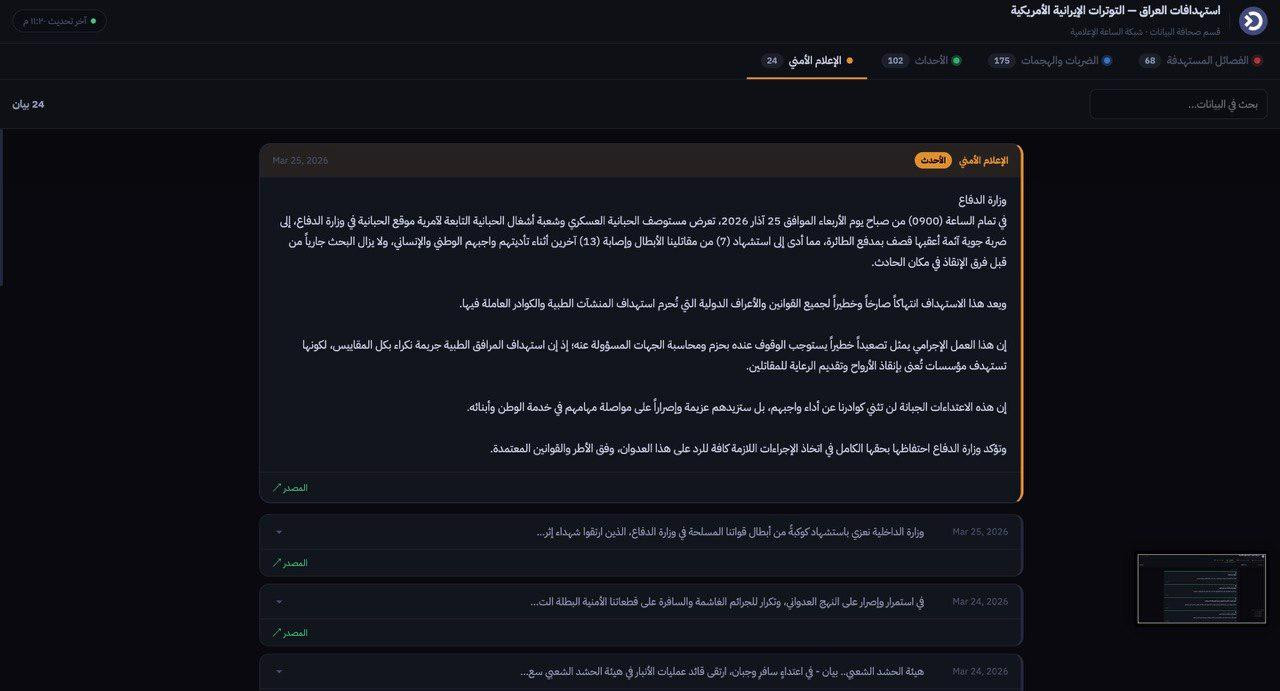 4- الإعلام الأمني: بيانات رسمية موثقة صادرة عن الإعلام الأمني العراقي حول أحداث الحرب والضربات الأمريكية على العراق و استهدافات والقواعد العسكرية والبعثات الدبلوماسية داخل العراق.
