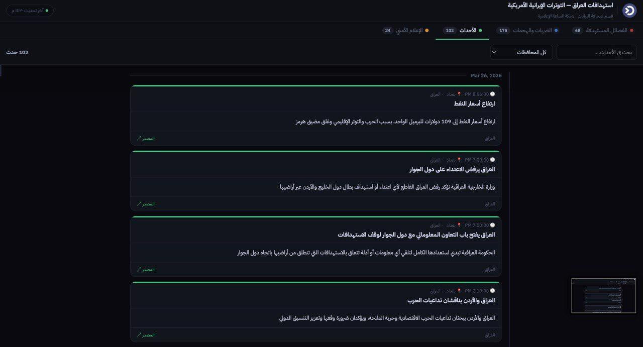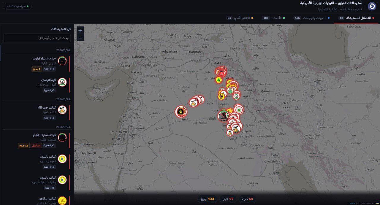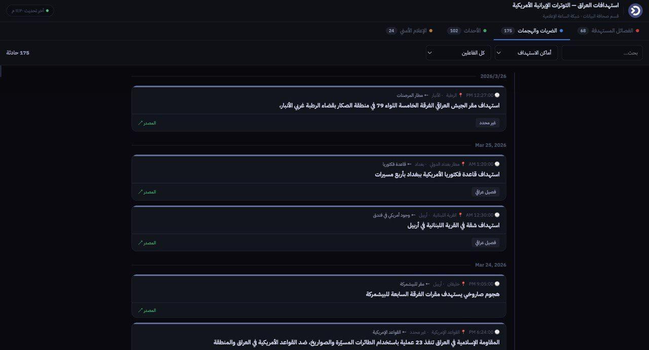 تقدّم شبكة الساعة — قسم صحافة البيانات — متابعةً لحظيةً لمجريات الحرب بين أمريكا وإسرائيل وإيران، والتي ألقت بظلالها على العراق بسبب علاقته بطهران وارتباط بعض الفصائل المسلحة العراقية بها، وذلك عبر خارطة تفاعلية تجمع — لأول مرة — بين بيانات الضربات الأمريكية والإسرائيلية، واستهدافات الفصائل العراقية في الداخل والخارج، وبيانات الإعلام الأمني العراقي، ضمن منصة موحّدة تُحدَّث تلقائياً على مدار الساعة.