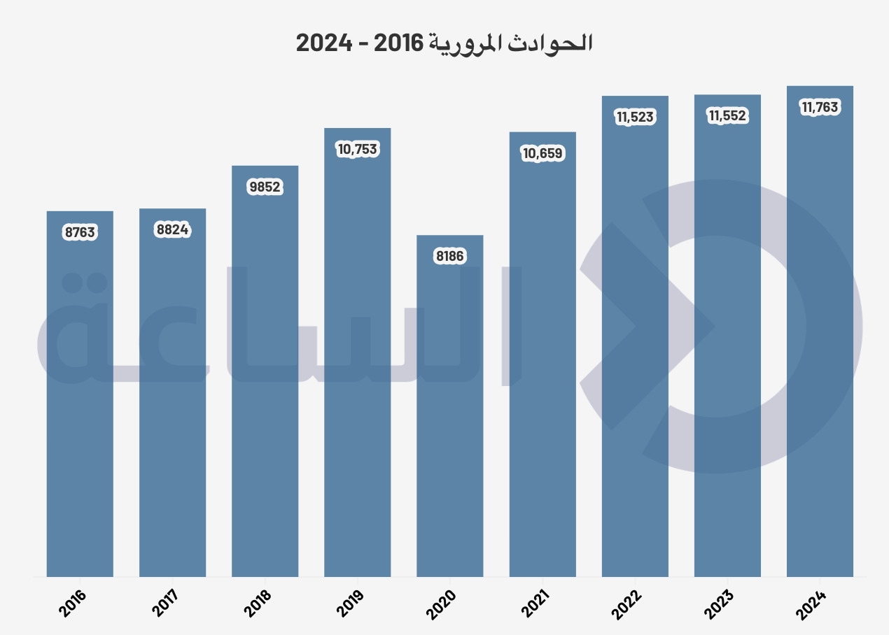 وتشير البيانات إلى تصاعد تدريجي في أعداد الحوادث منذ عام 2016، مع تسجيل تراجع ملحوظ في عام 2020، قد تكون بسبب قيود الحركة خلال جائحة كورونا، قبل أن تعود الأرقام للارتفاع في السنوات اللاحقة، حيث تجاوز عدد الحوادث 11 ألف حادث سنويًا في أعوام 2022 و2023 و2024.