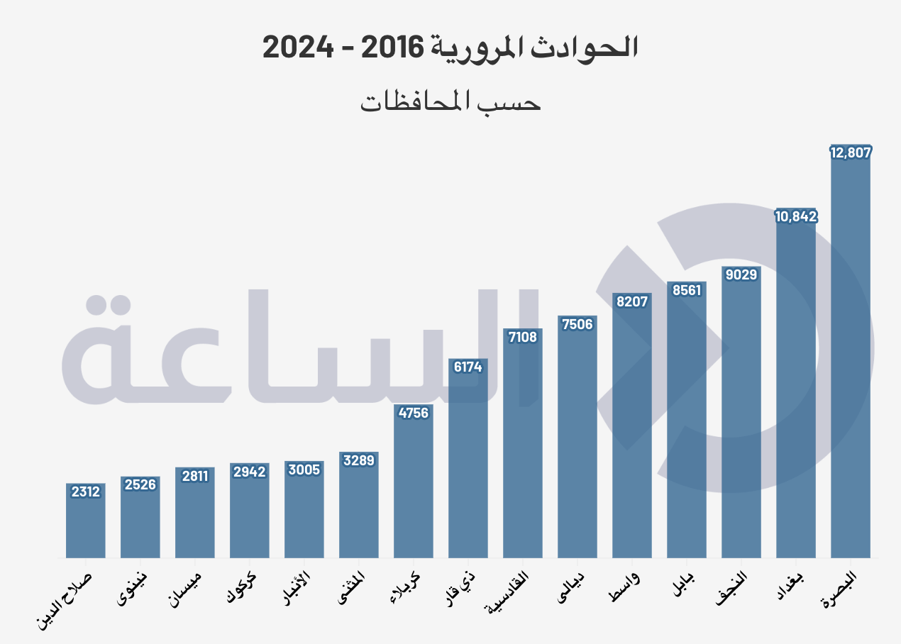 كشفت بيانات إحصائية عن تسجيل 8,763 حادث سير في عدد من محافظات العراق خلال عام 2016، نتج عنها 2,531 وفاة و9,016 جريحاً، ووفق الأرقام، تصدّرت بغداد قائمة المحافظات الأعلى تسجيلاً للحوادث بـ 1,111 حادثاً، مشكلةً نحو %12.68 من إجمالي الحوادث المسجلة. وجاءت البصرة في المرتبة الثانية بـ 1,079 حادثاً (%12.31)، تلتها النجف بـ 1,054 حادثاً (%12.03).