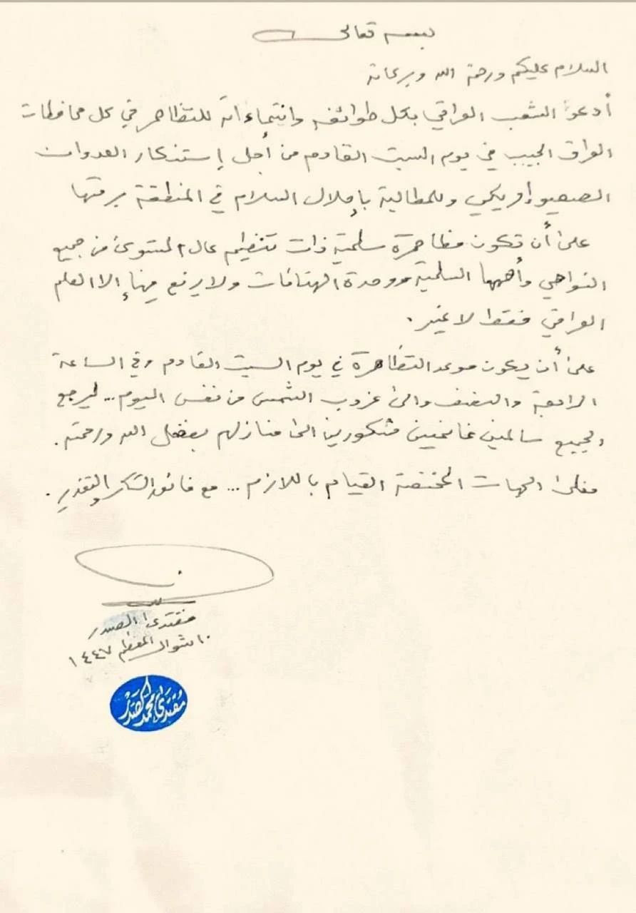 وشدد على "ضرورة أن تكون التظاهرات سلمية ومنظمة بشكل عالٍ، مع الالتزام برفع العلم العراقي فقط وتوحيد الشعارات، بما يعكس وحدة الموقف الشعبي، وتنطلق في تمام الساعة الرابعة والنصف عصراً وحتى غروب الشمس".