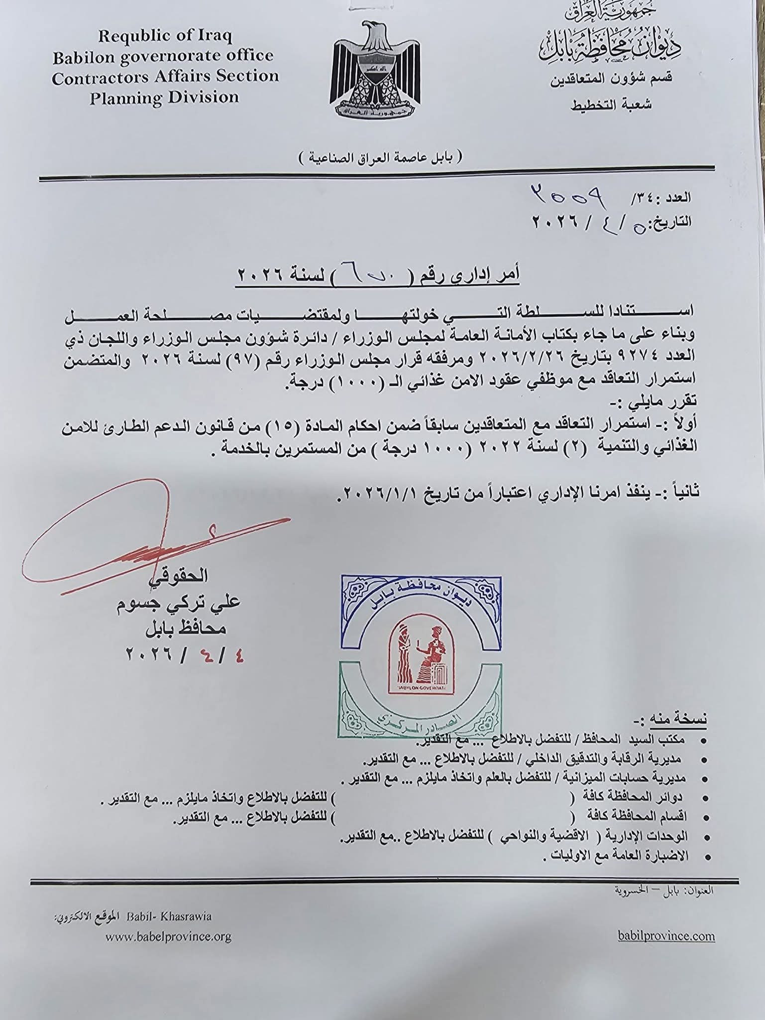 أعلن محافظ بابل، اليوم الأحد، استمرار التعاقد مع الموظفين المشمولين بعقود الأمن الغذائي، البالغ عددهم ألف درجة وظيفية، استناداً إلى الصلاحيات المخولة ومقتضيات مصلحة العمل.