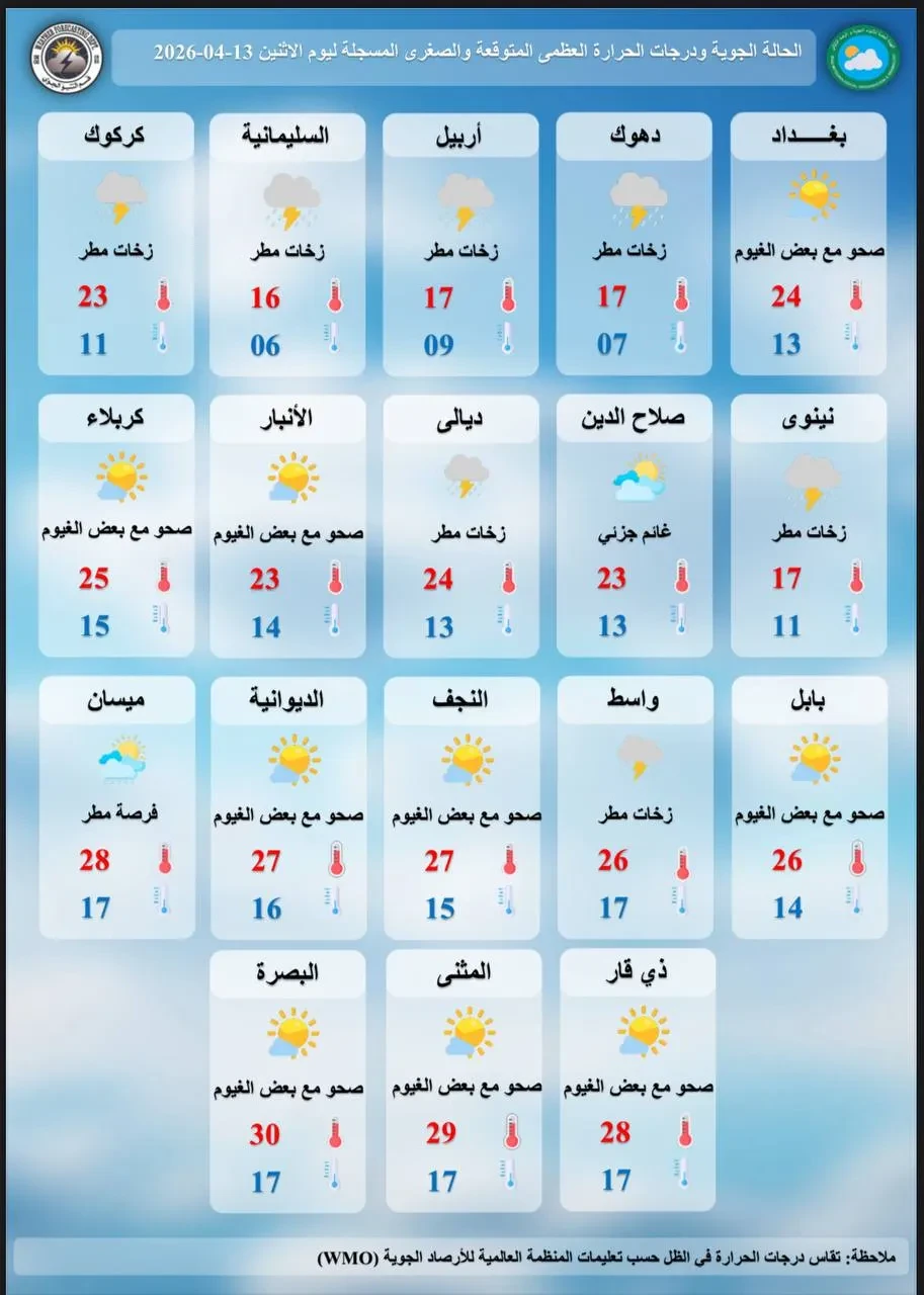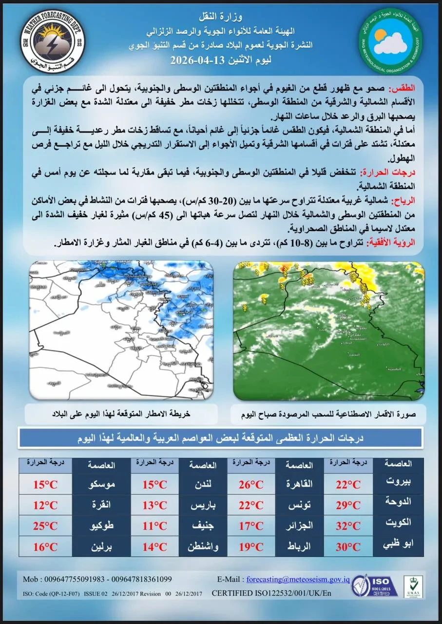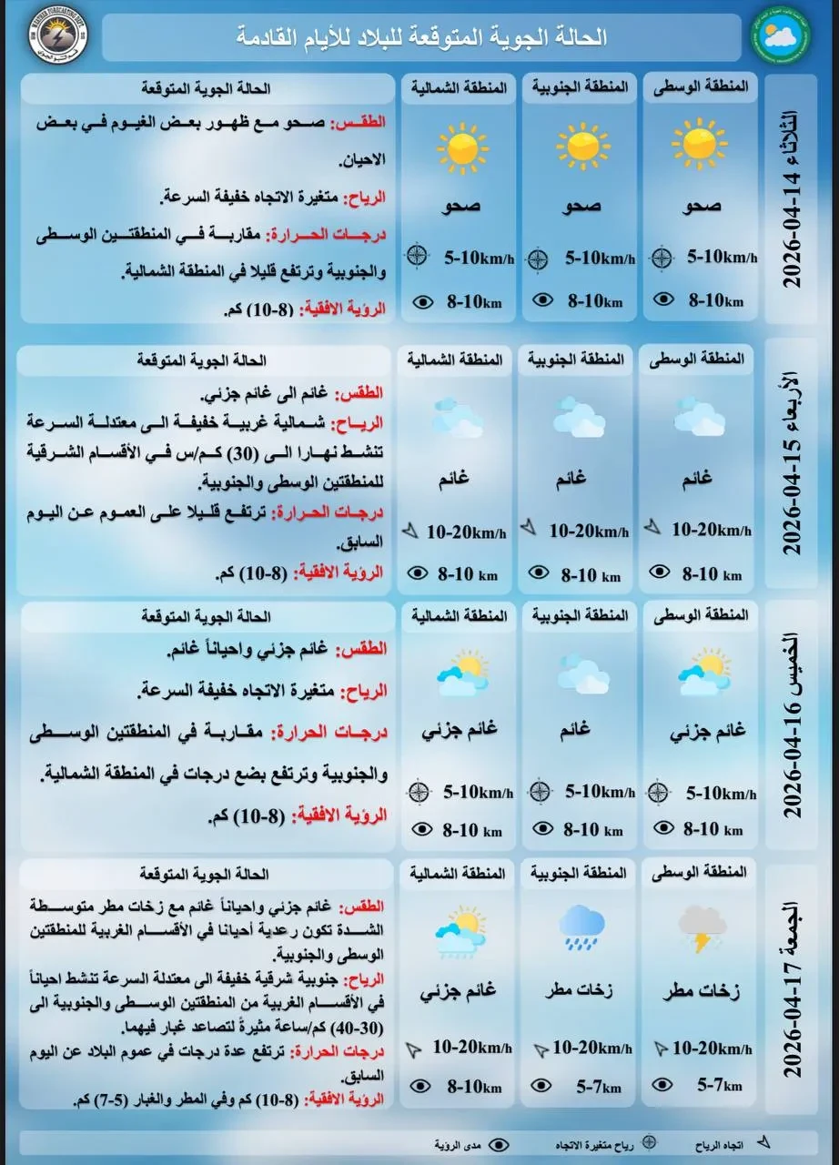 توقعت هيئة الأنواء الجوية، اليوم الاثنين، أن تشهد البلاد حالة من عدم الاستقرار الجوي، تتخللها أمطار رعدية متفرقة في عدد من المناطق، بالتزامن مع انخفاض طفيف في درجات الحرارة، مبينة أن الأجواء ستكون بين غائمة جزئياً وغائمة على فترات، مع احتمالية نشاط للرياح في بعض المناطق خلال أوقات متقطعة من اليوم.