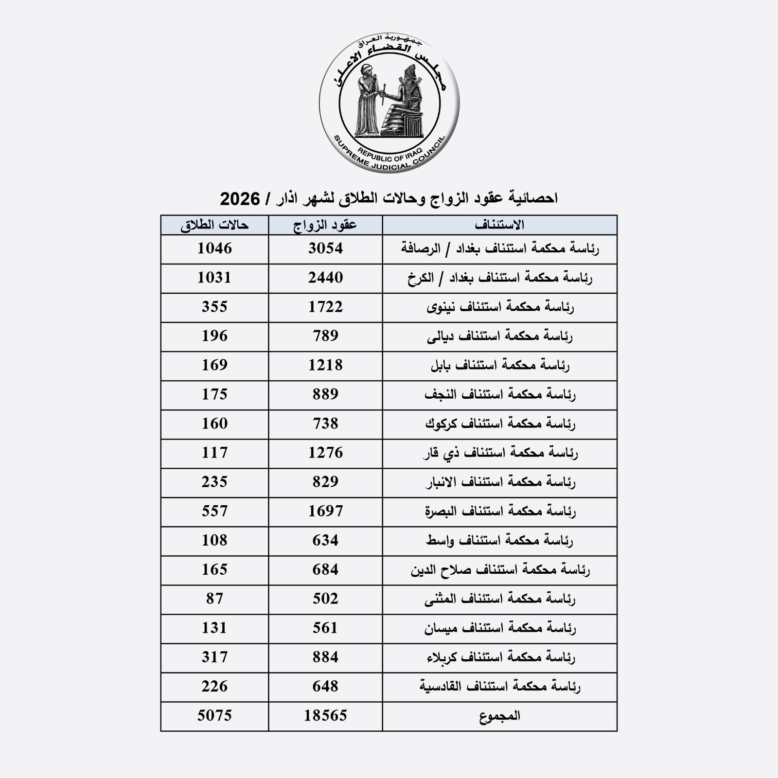 أعلن مجلس القضاء الأعلى، اليوم الأربعاء، إحصائية رسمية لعدد حالات الزواج والطلاق المسجلة في عموم العراق لشهر آذار 2026.