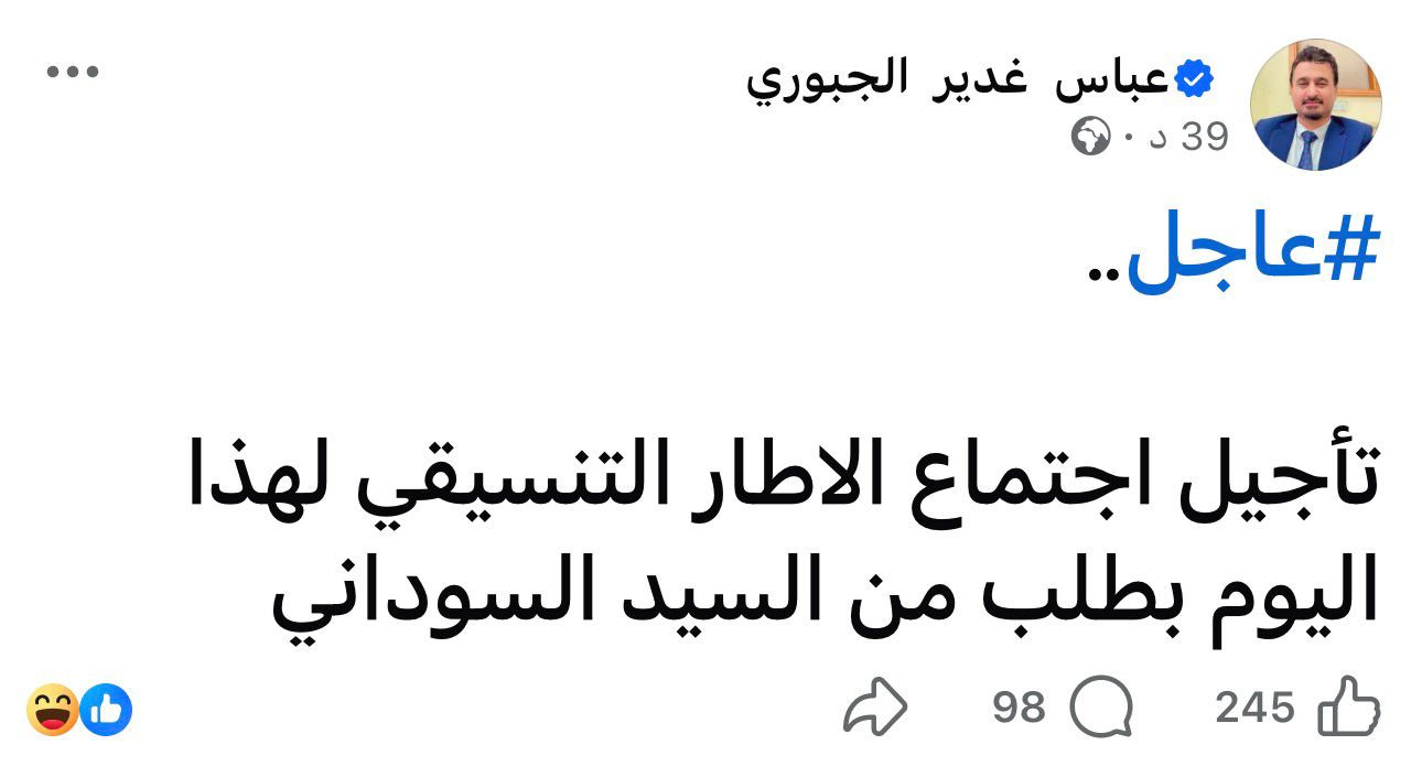 وذكر الجبوري في منشور على "فيسبوك"، وتابعته شبكة "الساعة"، أن "اجتماع الإطار التنسيقي المقرر عقده اليوم قد تم تأجيله، وذلك بناءً على طلب رئيس الوزراء محمد شياع السوداني".