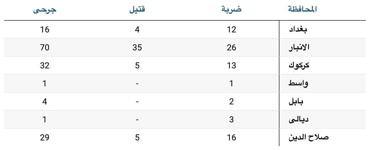 جغرافيًا، تُظهر الأرقام أن محافظة الأنبار تصدرت المشهد بشكل واضح، حيث سجلت ما يقارب 50% من إجمالي الخسائر، خاصة في مناطق القائم، عكاشات، الحبانية، والرطبة. تليها بغداد وبابل وكركوك، بينما ظهرت إصابات متفرقة في نينوى وصلاح الدين والبصرة وأربيل.