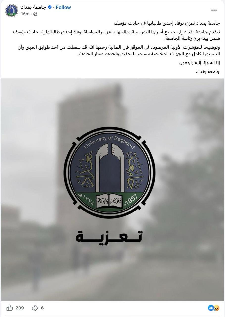 نعت جامعة بغداد إحدى طالباتها التي توفيت إثر حادث سقوط داخل مبنى رئاسة الجامعة، من دون معرفة الأسباب حتى الآن.