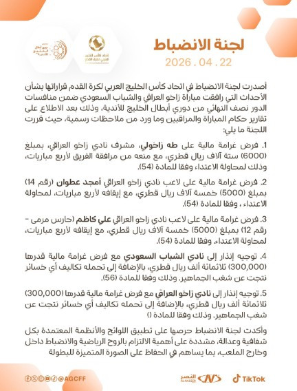 أصدرت لجنة الانضباط في اتحاد كأس الخليج العربي، اليوم الأربعاء، عقوبات مالية على خلفية أحداث مباراة زاخو والشباب السعودي، تضمنت غرامة قدرها 300 ألف ريال على نادي زاخو ومثلها على الشباب السعودي بسبب شغب الجماهير.