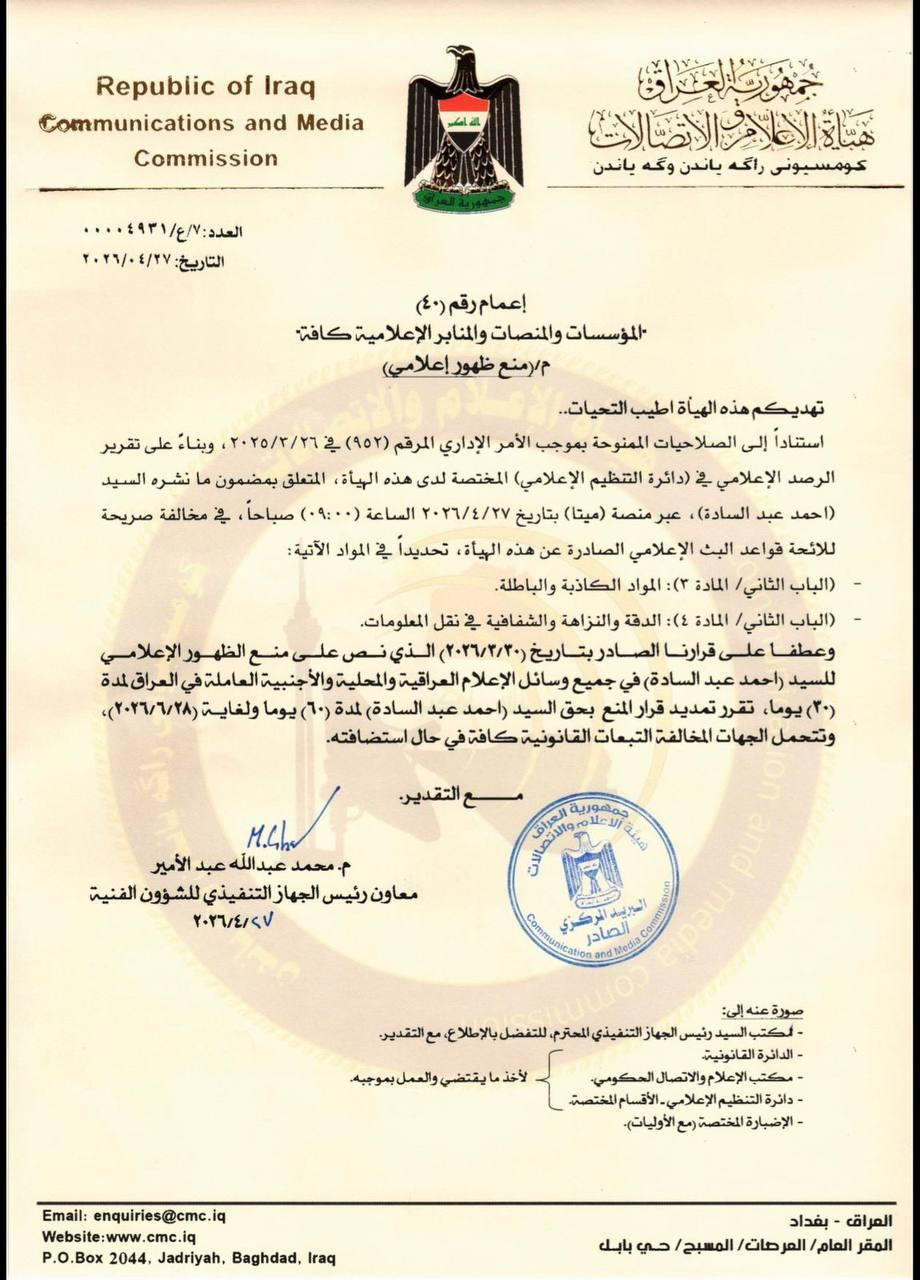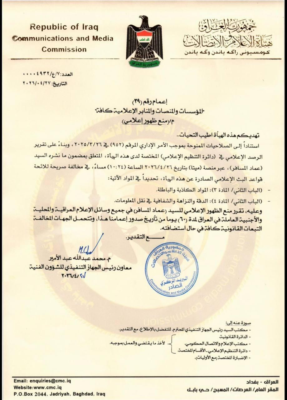 أصدرت هيئة الإعلام والاتصالات، اليوم الاثنين، إعماماً رسمياً يقضي بمنع الظهور الإعلامي للمحللان السياسيان المقربان من الفصائل المسلحة "عماد المسافر" و "احمد عبد السادة" في جميع وسائل الإعلام العراقية والأجنبية العاملة في البلاد لمدة 60 يوما.