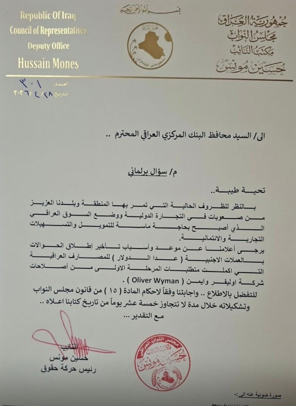وجّهت اللجنة المالية النيابية، اليوم الثلاثاء، سؤالًا إلى محافظ البنك المركزي بشأن تأخر إطلاق الحوالات الخارجية بالعملات الأجنبية للمصارف العراقية، وذلك بحسب وثيقة اطلعت عليها شبكة "الساعة".