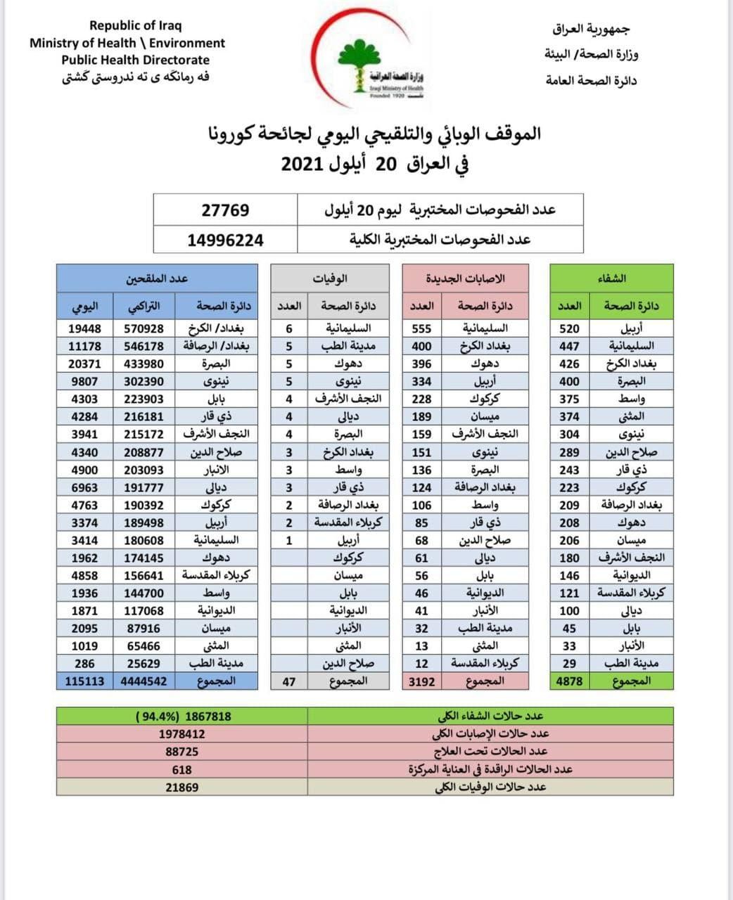 وأضافت الوزارة أن المجموع الكلي لإصابات كورونا في العراق منذ بداية جائحة كورونا ارتفع إلى 1978412 إصابة، فيما بلغت حالات الشفاء الكلية 1867818 حالة، أما حالات الوفاة فارتفعت إلى 21869 حالة.