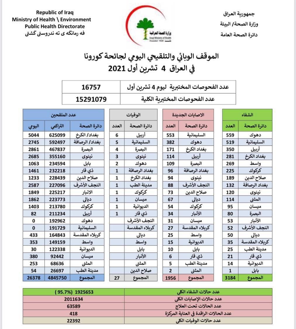 سجلت وزارة الصحة العراقية، 27 حالة وفاة ضمن الموقف الوبائي لفيروس كورونا، اليوم الإثنين.