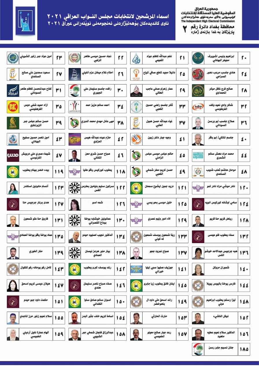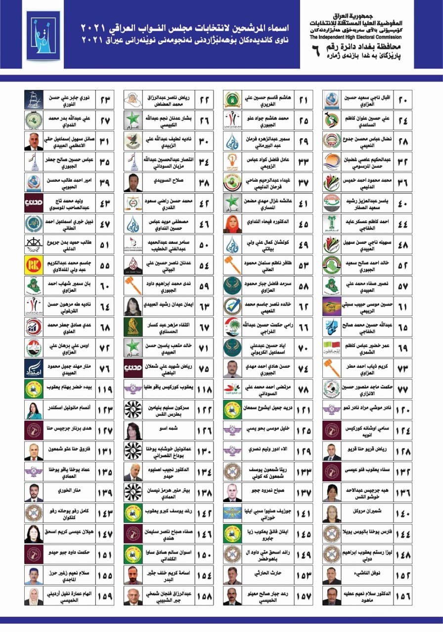 الكرادة - الزعفرانية - الوليد - السعدون - الربيع - الرصافة الاولى - كمب سارة - الفاروق - الرصافة الثانية - الرصافة الثالثة
