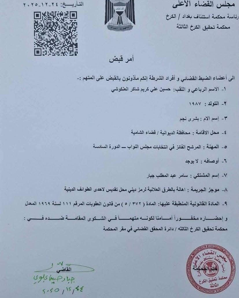 أصدرت محكمة تحقيق الكرخ الثالثة، اليوم الأربعاء، مذكرة قبض بحق النائب عن الديوانية حسين العنكوشي وفق المادة ٣٧٢/ ٥ من قانون العقوبات العراقي، بحسب وثيقة حصلت عليها شبكة "الساعة".