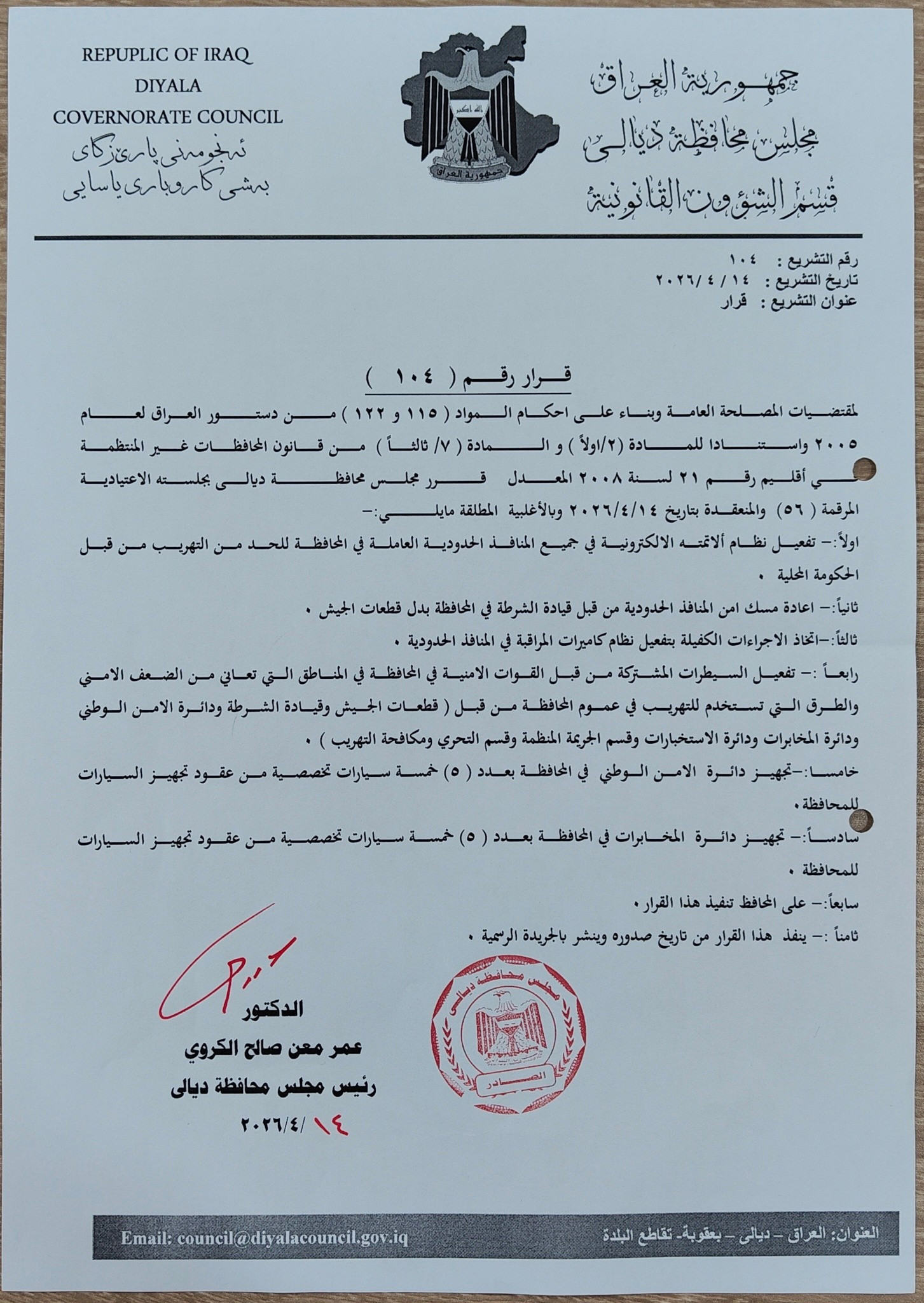 أصدر مجلس محافظة ديالى، اليوم الثلاثاء، القرار رقم (104) في جلسته المنعقدة بتاريخ 14 نيسان/أبريل 2026، متضمناً سلسلة إجراءات أمنية وإدارية لتعزيز الاستقرار والحد من عمليات التهريب.